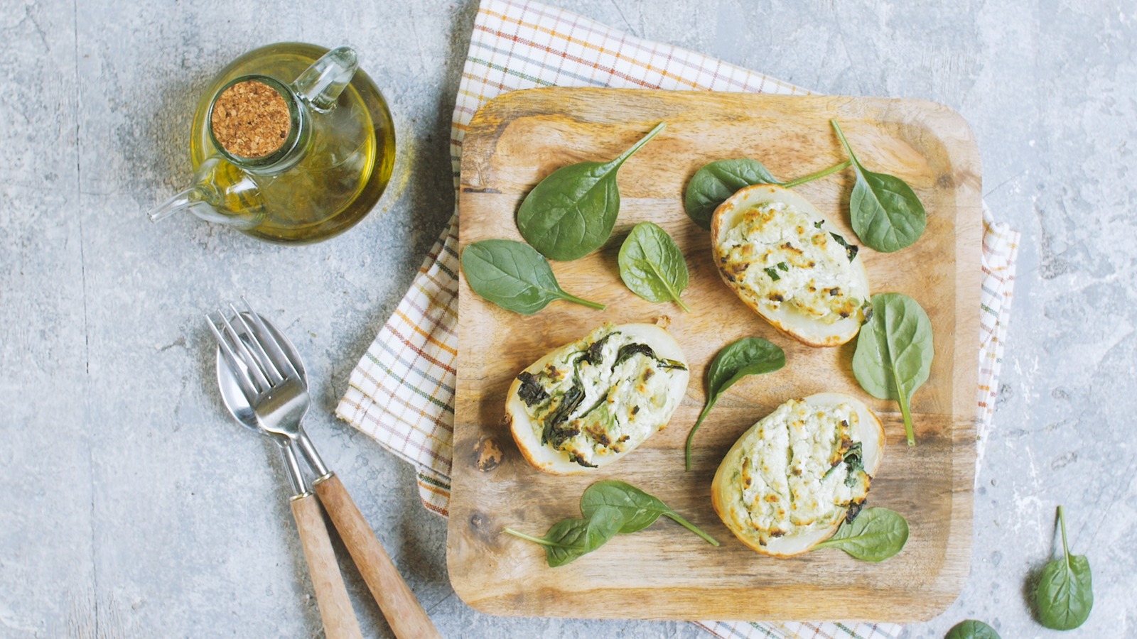 Muito fácil de fazer, a batata recheada com requeijão, abacate e espinafres é um delicioso acompanhamento que segue os princípios da dieta mediterrânica e faz de qualquer refeição um momento especial.