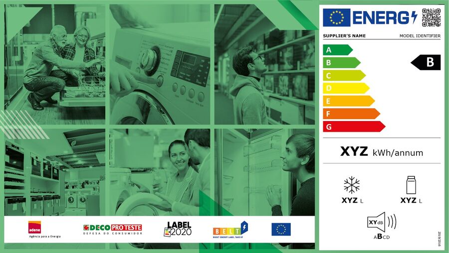 Dois projetos estiveram a apoiar a implementação da nova etiqueta energética,o BELT (Boost Energy Label Take Up) e o LABEL2020, financiados pela União Europeia ao abrigo do programa "Horizonte 2020" sob os contratos de subvenção nº 847043 e 847062, respetivamente. Estes projetos visam ainda a adoção de produtos mais eficientes ao nível europeu. Em Portugal, a DECO PROTESTE, em colaboração com a Worten, é responsável pela implementação do Projeto BELT enquanto a ADENE, em estreita coordenação com a Direção-Geral de Energia e Geologia, é a entidade responsável pela implementação do projeto LABEL2020.